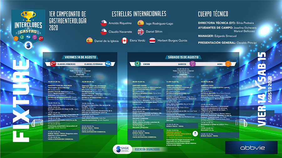 SAGE los invita a participar en el 1º Campeonato Interclubes de Gastroenterología 2020 que se llevará a cabo los días 14 y 15 de agosto del corriente año en modalidad Online y que está organizando SAGE junto con los distintos Grupos de Trabajos de las Subespecialidades gastroenterológicas.