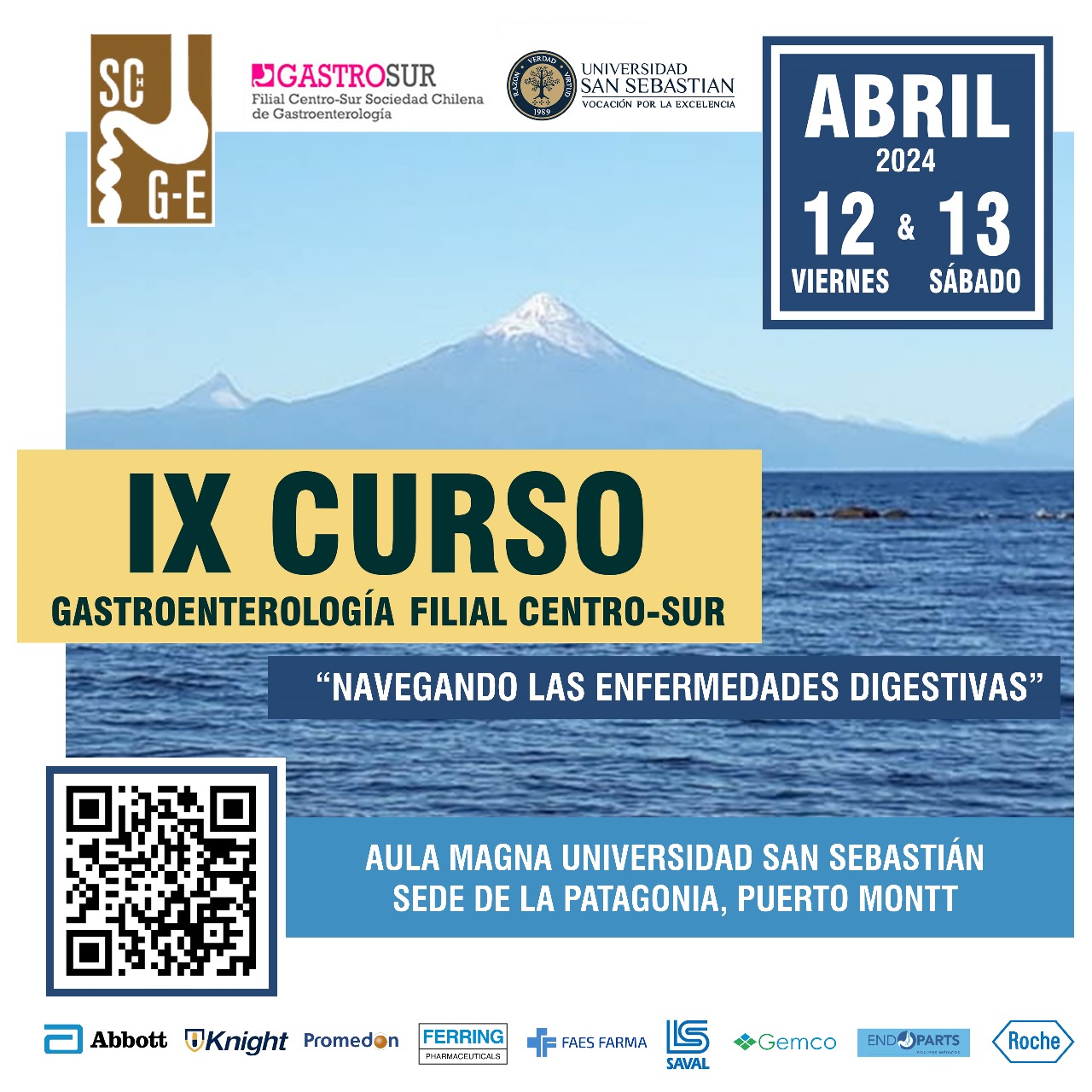 Los días 12 y 13 de abril de 2024, la Sociedad Chilena de Gastroenterología (SChGE) a través de su filial regional GastroSur, junto a la Universidad San Sebastián (USS), llevarán a cabo la novena versión del curso "Navegando las enfermedades digestivas". La actividad se realizará en el Aula Magna de la Universidad San Sebastián, Sede De la Patagonia en Puerto Montt, con apoyo del área de Vinculación con el Medio de la Facultad de Medicina USS.